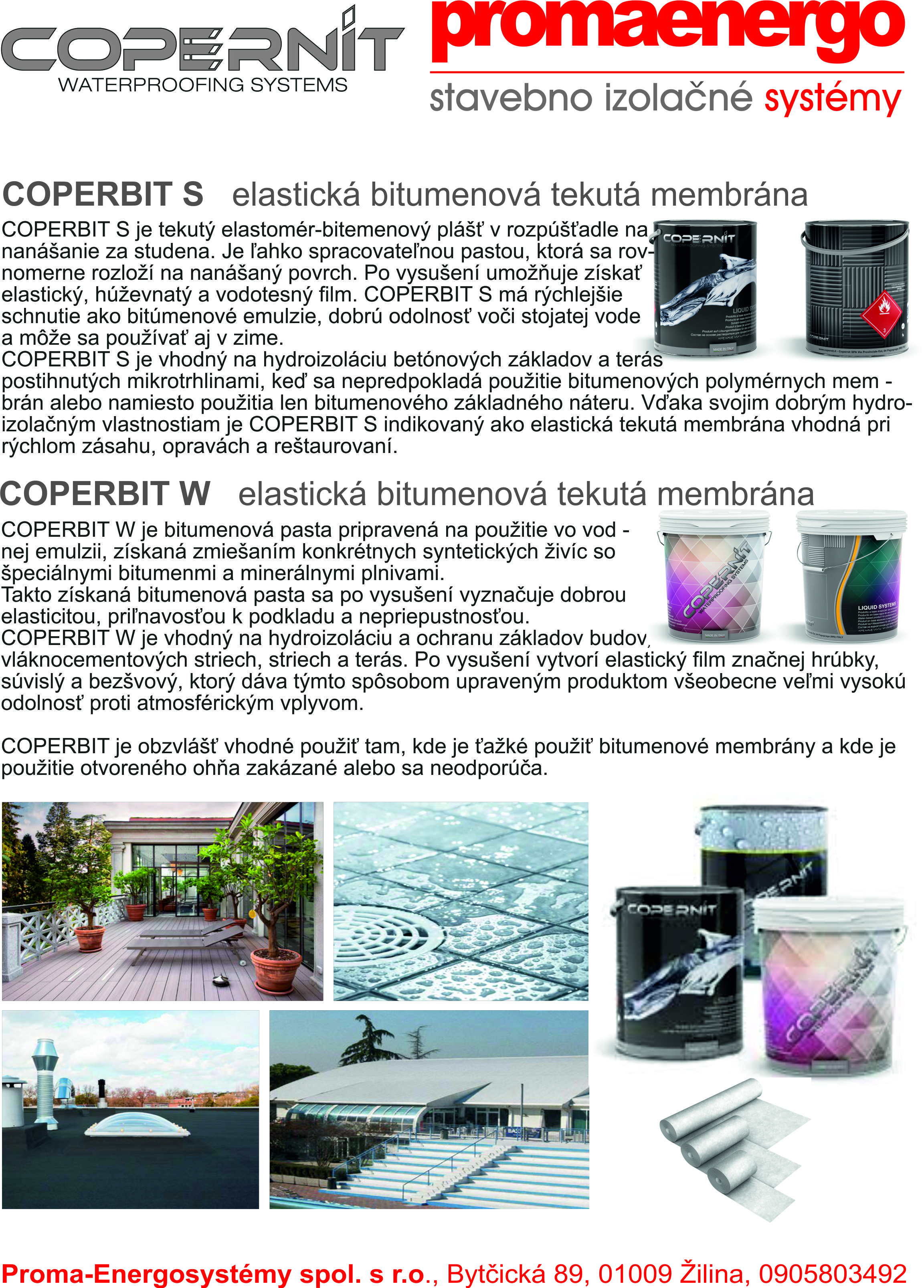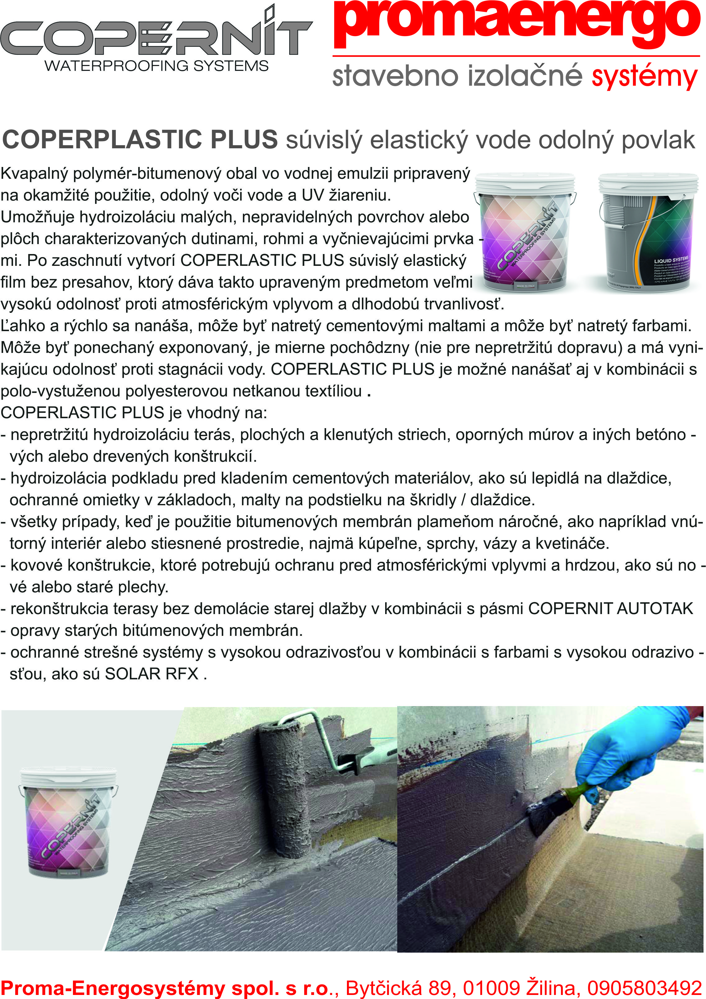 Oblasti použitia: vnútorná a vonkajšia aplikácia, hydroizolácia základov, hydroizolácia striech, hydroizolácia pod dlaždice, balkóny a terasy, izolácie nádrží a bazénov, renovácia starých bitúmenových hydroizolácií.